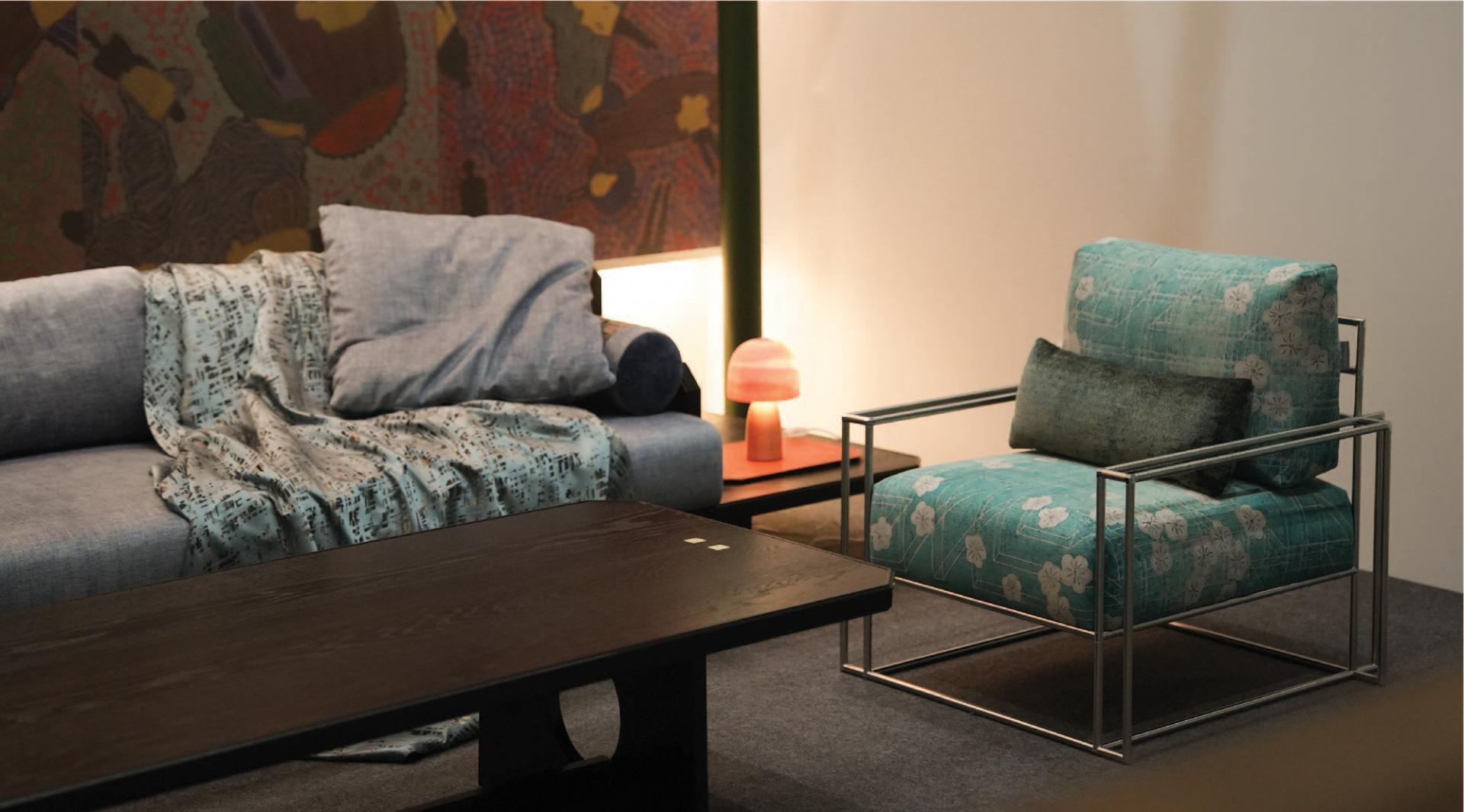블랙의 목재 프레임과 대비되는 다양한 색상의 쿠션 조합은 한국 전통 복식의 배색 미감을 연상시키며, 절제된 구조 속에 깊이 있는 시각적 리듬을 준다 .