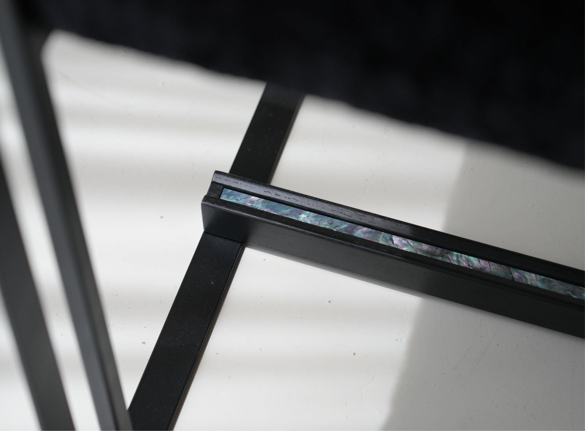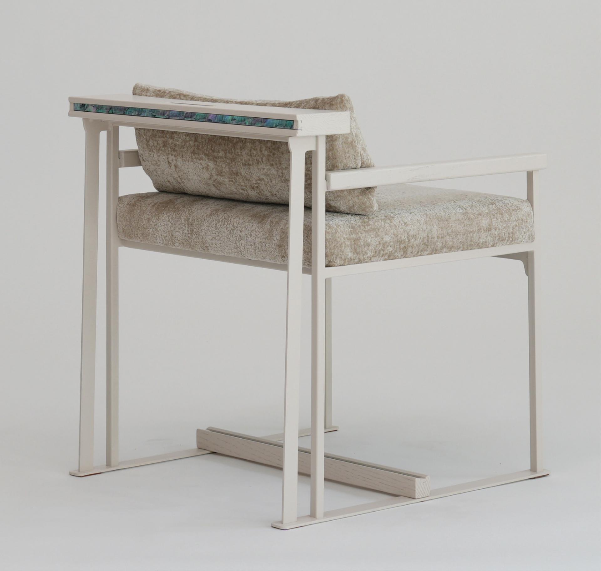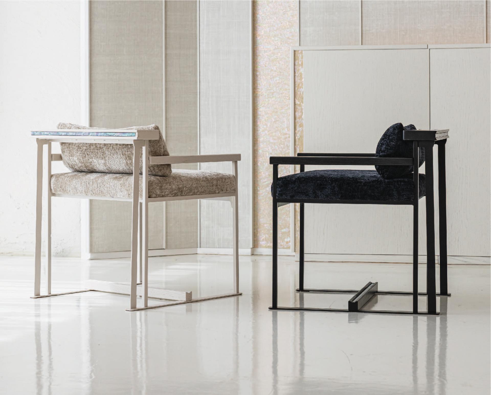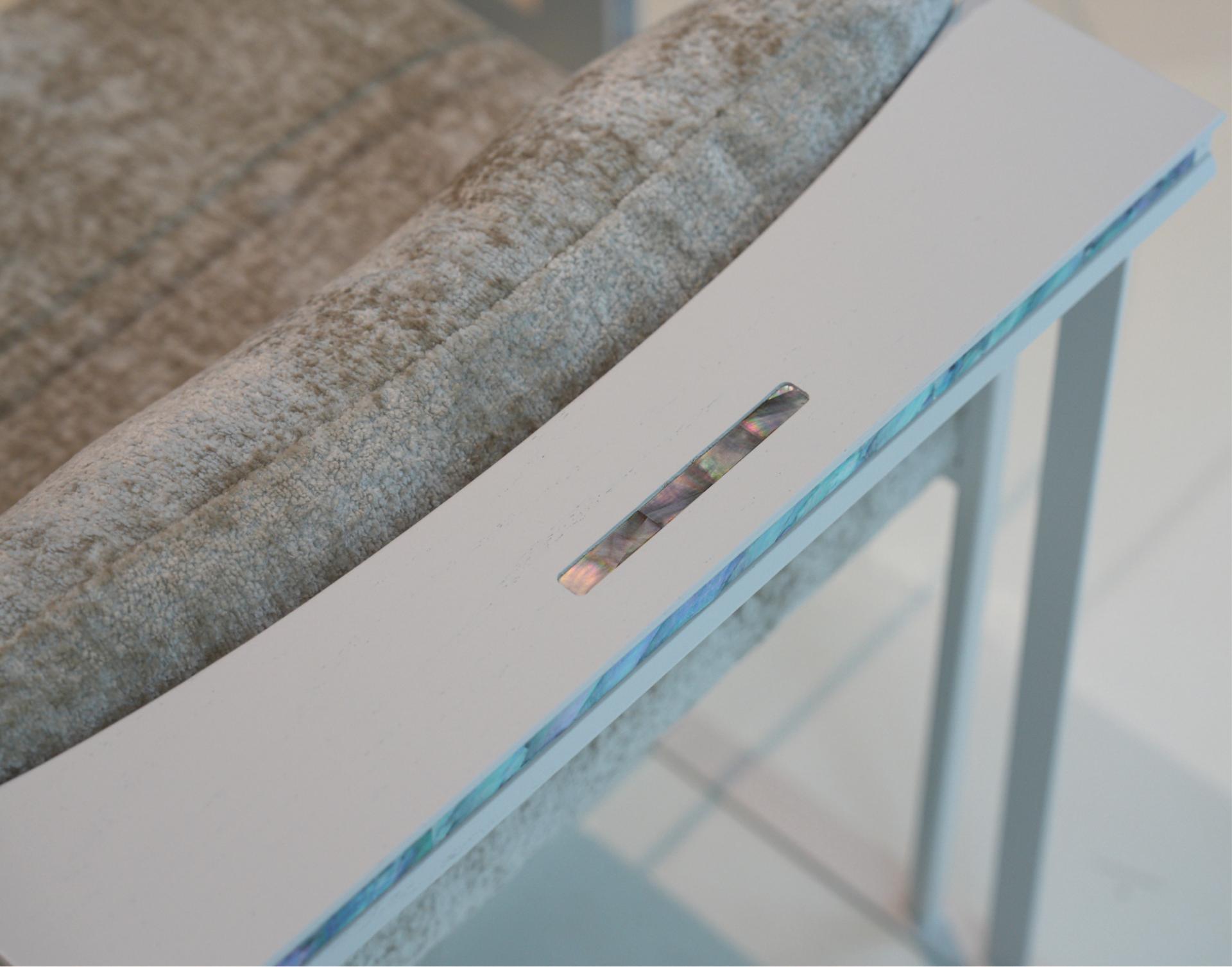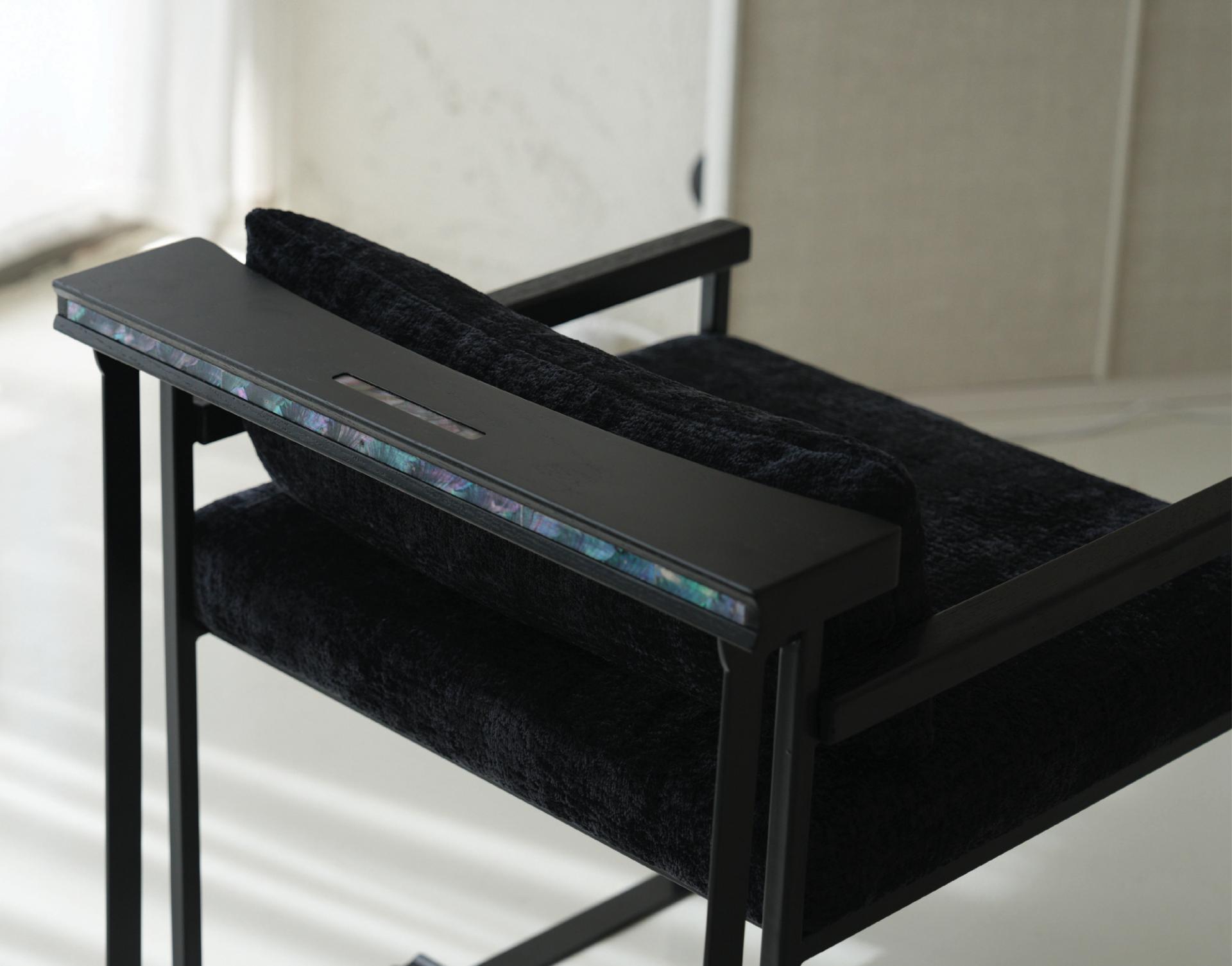 등받이 우드 디바이더와 우드상단에 섬세하게 적용된 자개 인레이 장식의 디테일은 동양적 감성과 현대적 모던함을 연결하는 상징적 요소다.