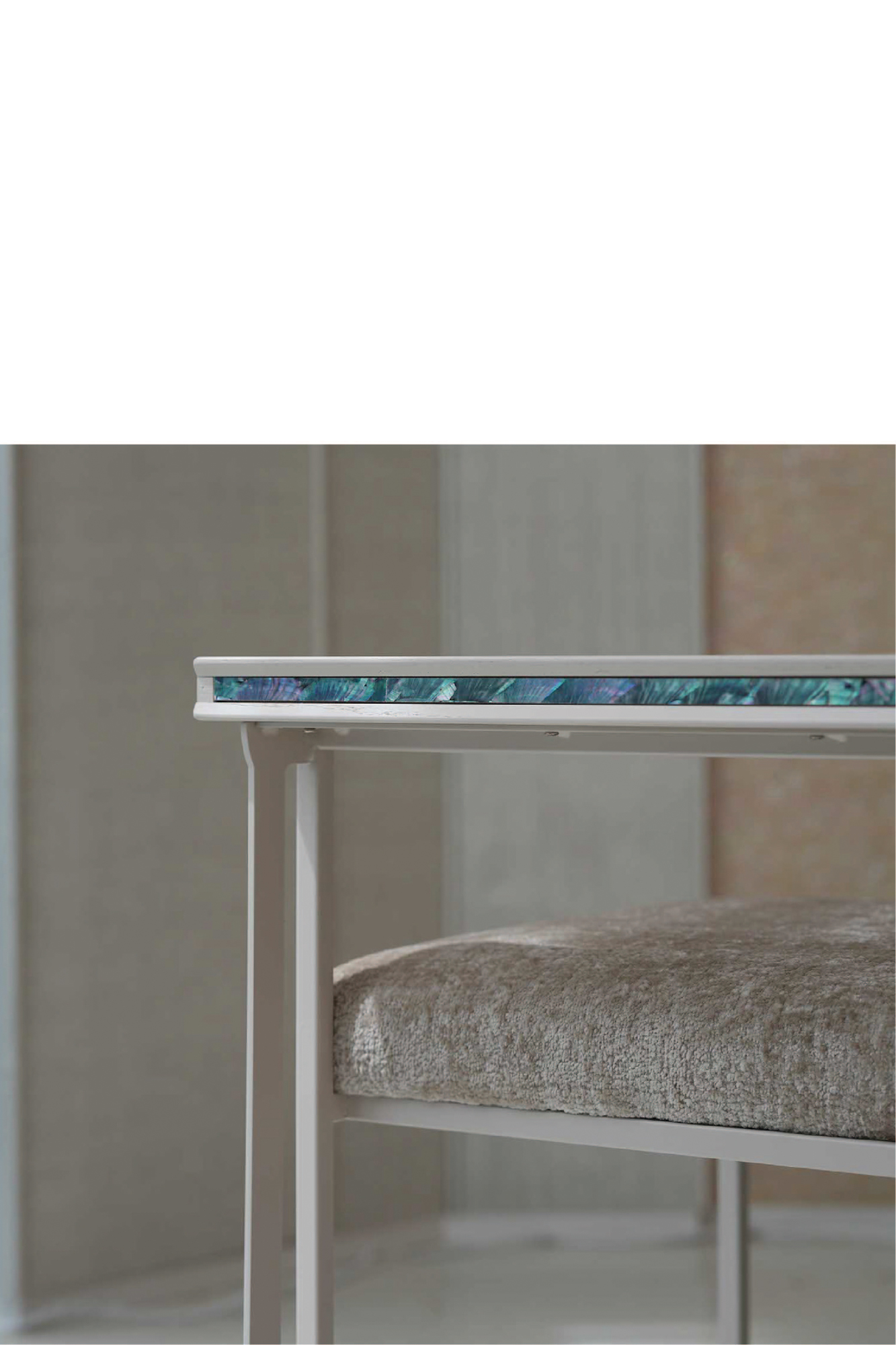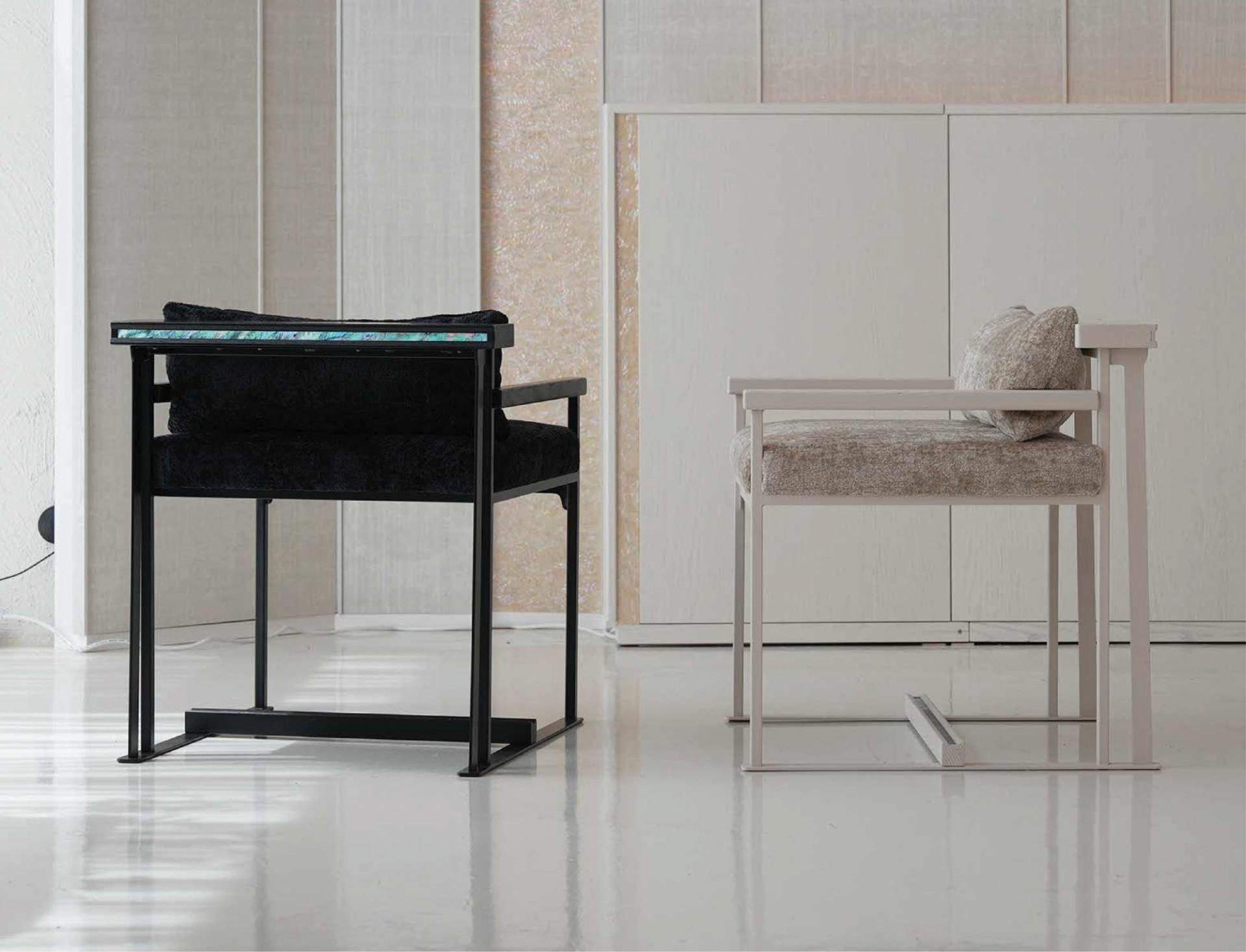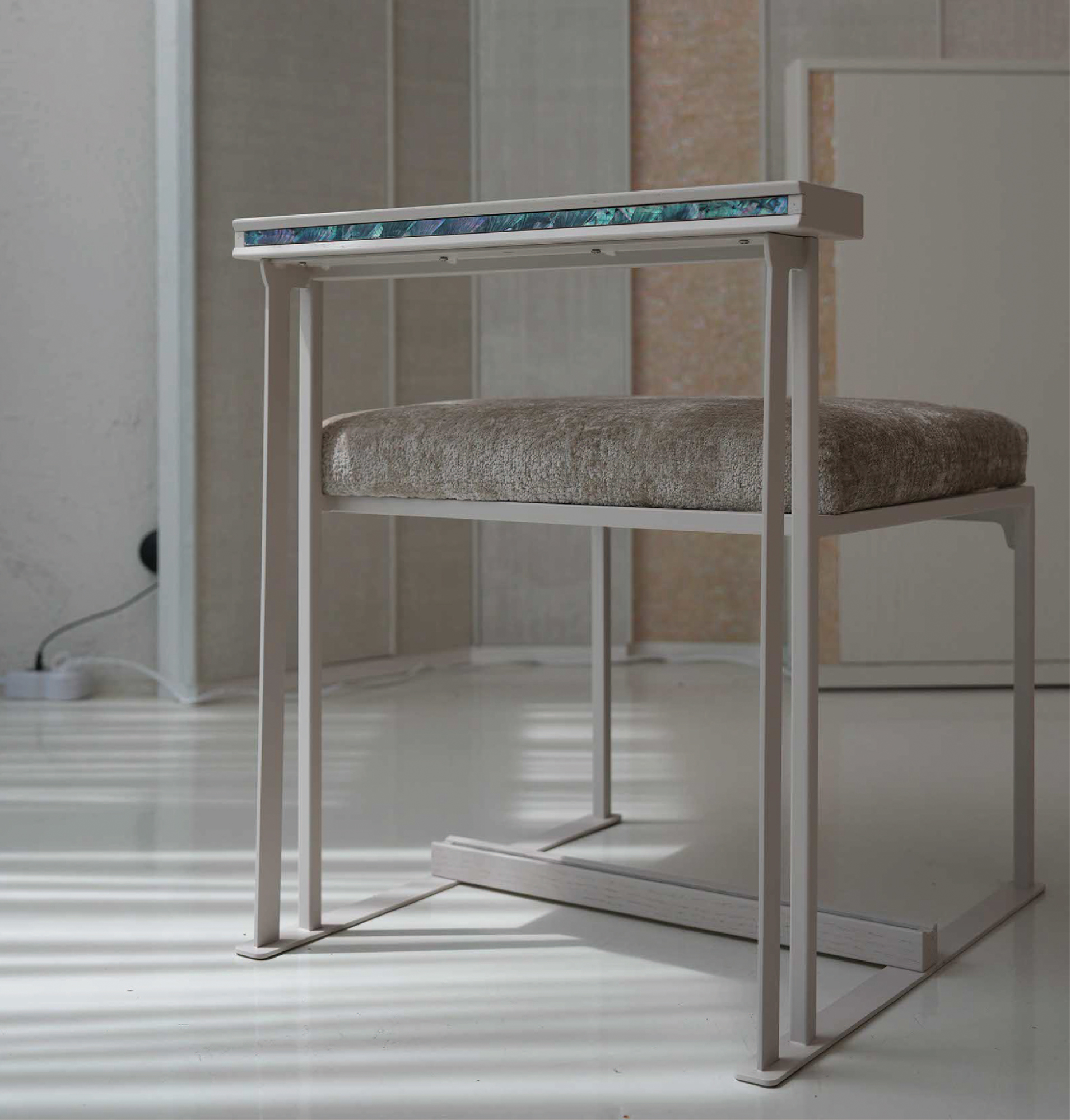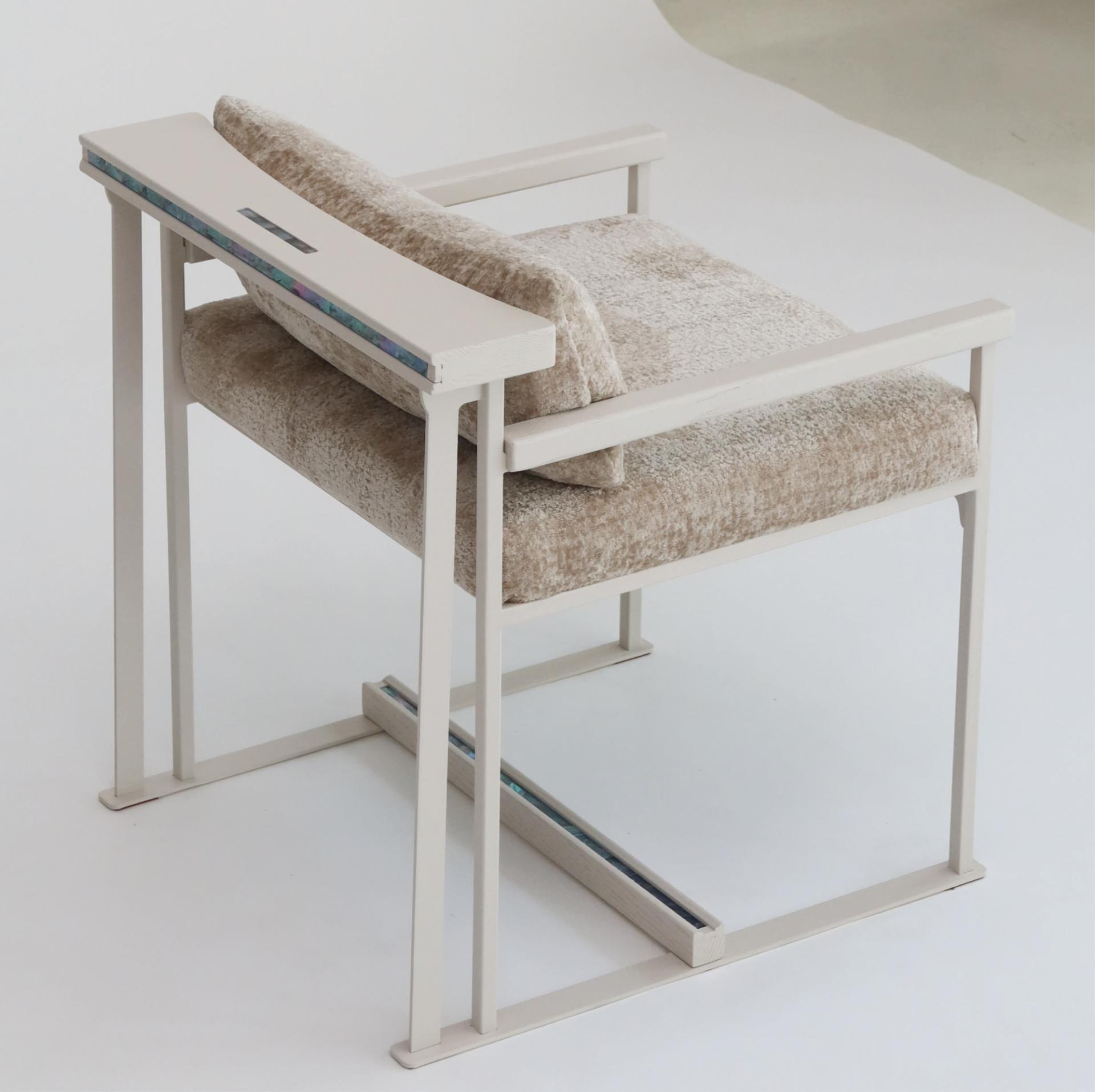 등받이 우드 디바이더와 우드상단에 섬세하게 적용된 자개 인레이 장식의 디테일은 동양적 감성과 현대적 모던함을 연결하는 상징적 요소다.