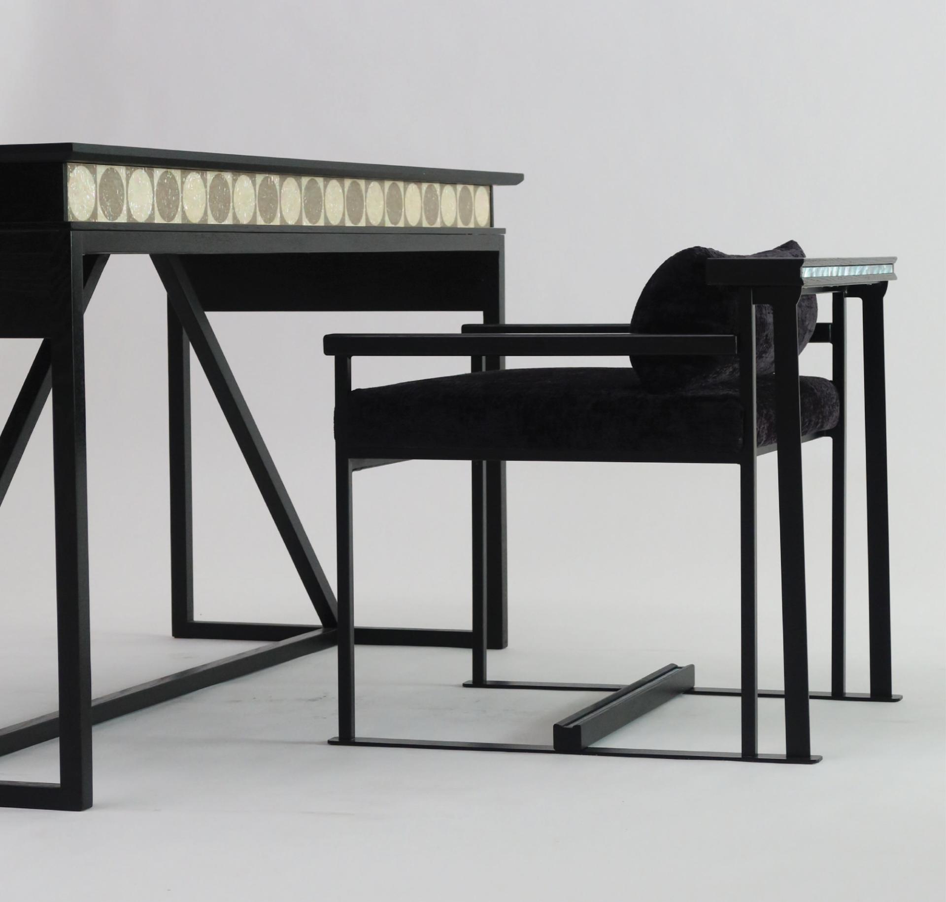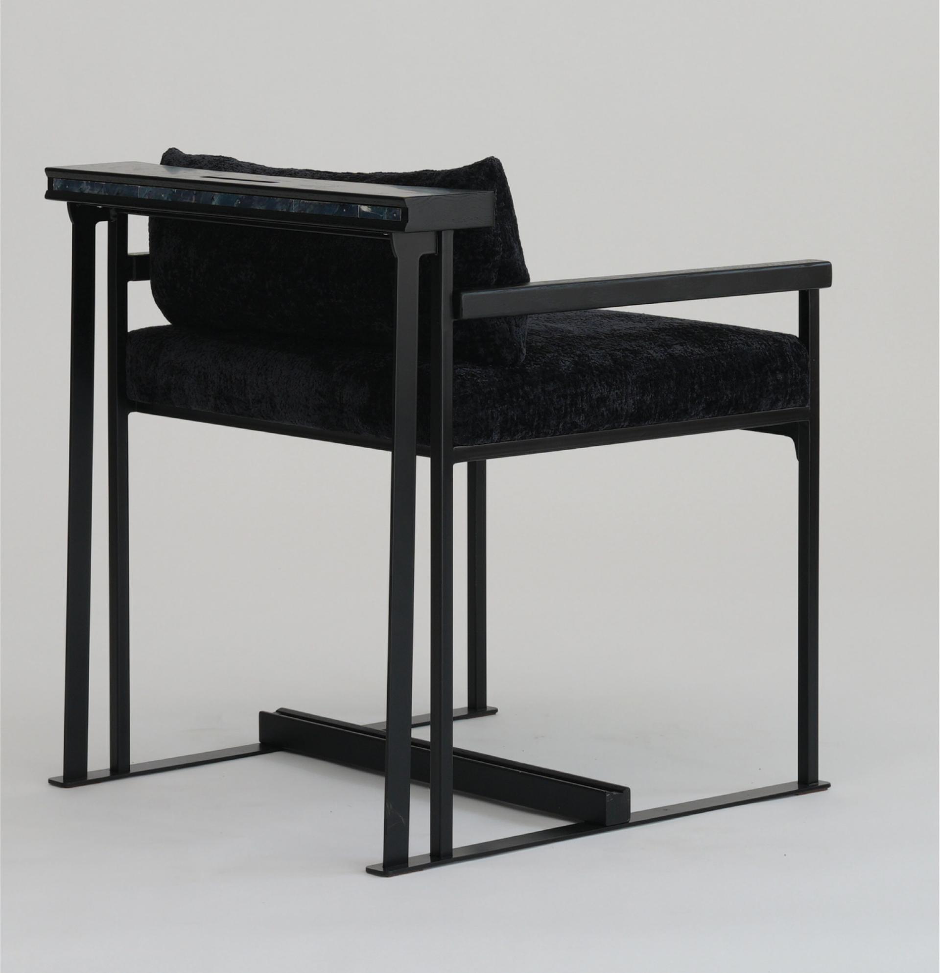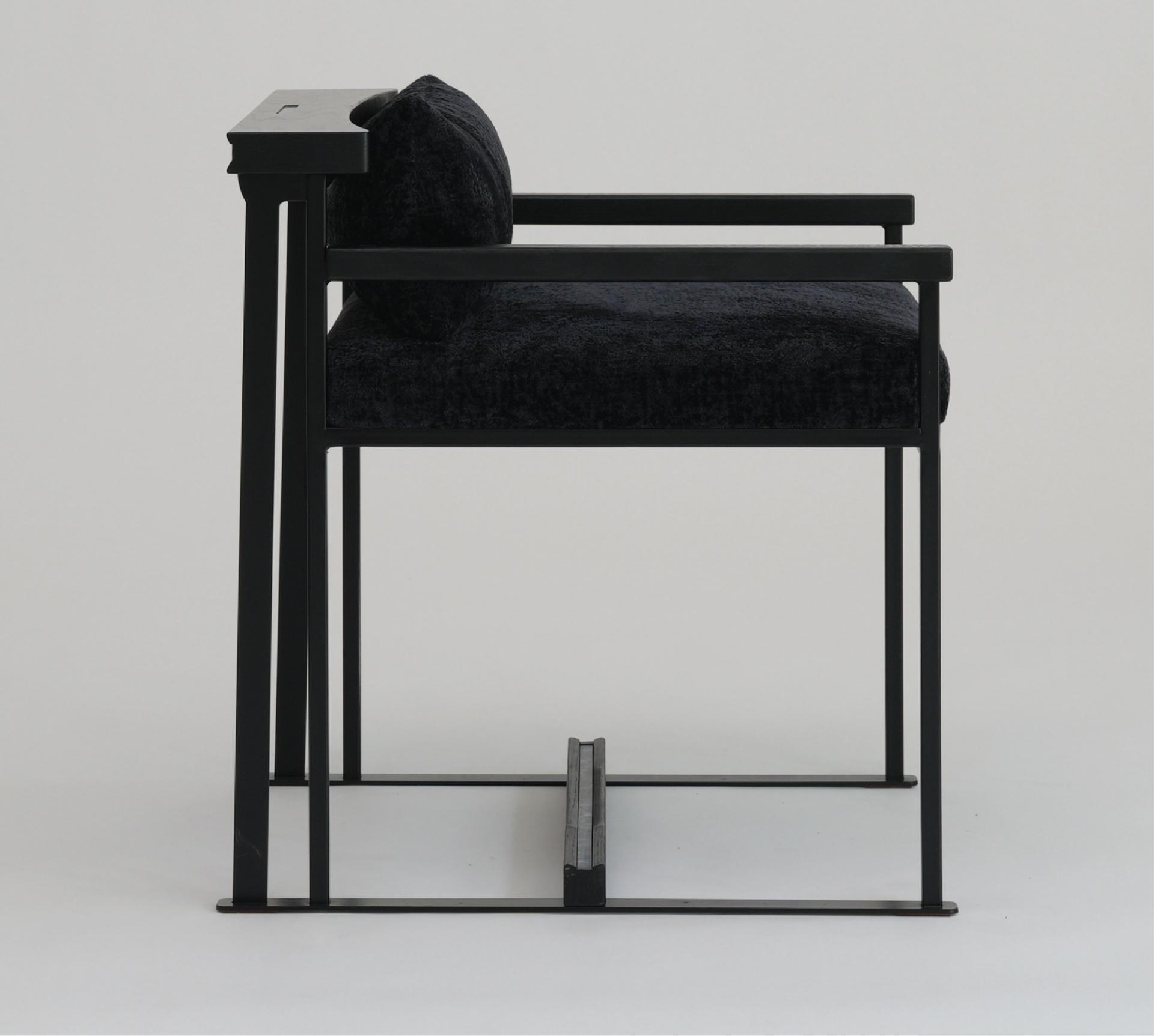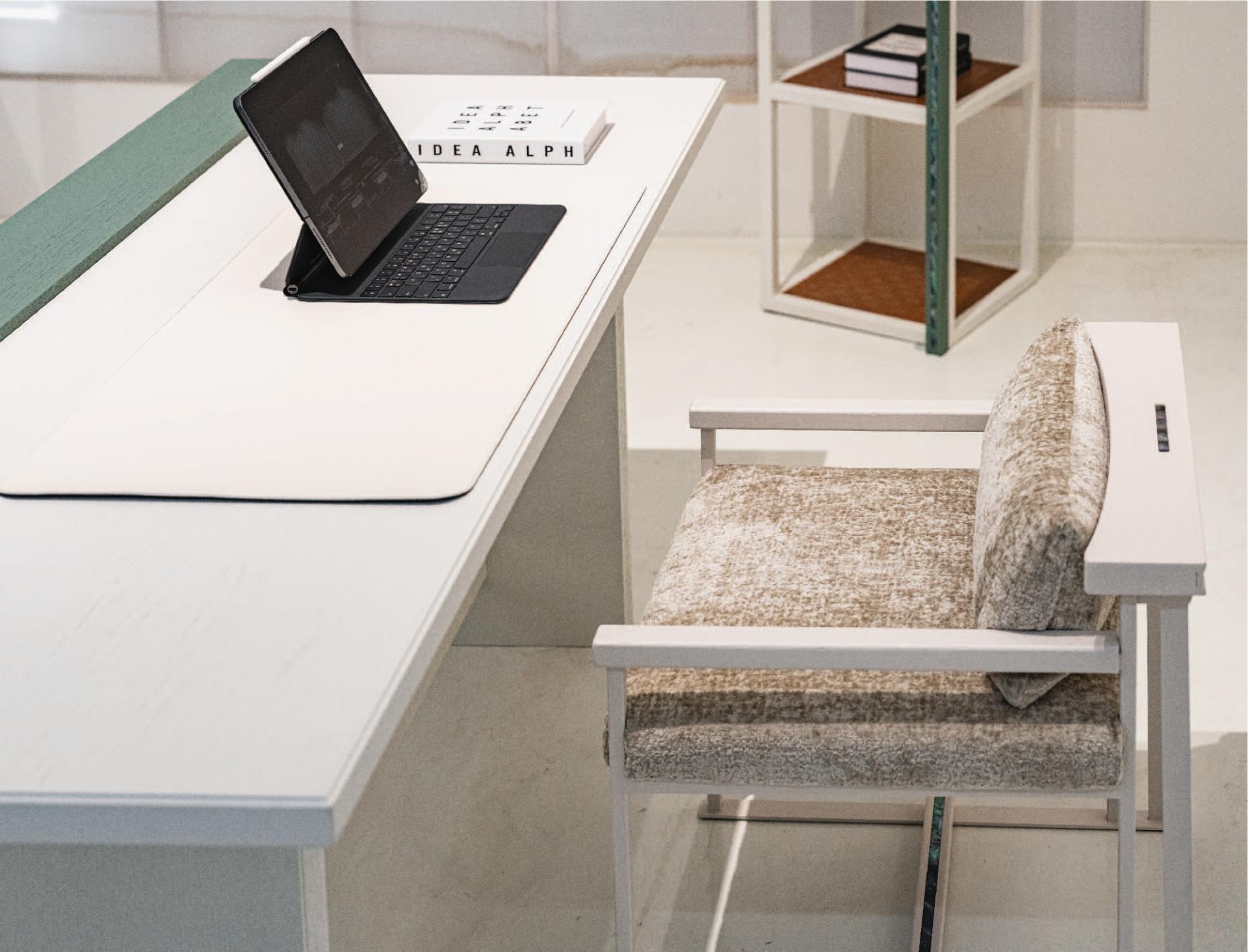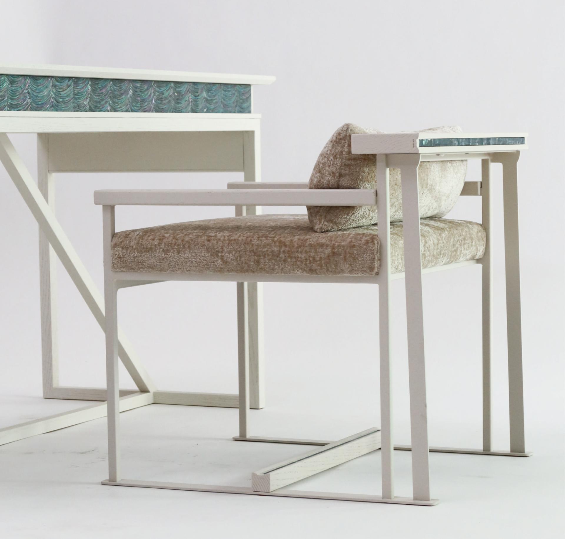 등받이 우드 디바이더와 우드상단에 섬세하게 적용된 자개 인레이 장식의 디테일은 동양적 감성과 현대적 모던함을 연결하는 상징적 요소다.