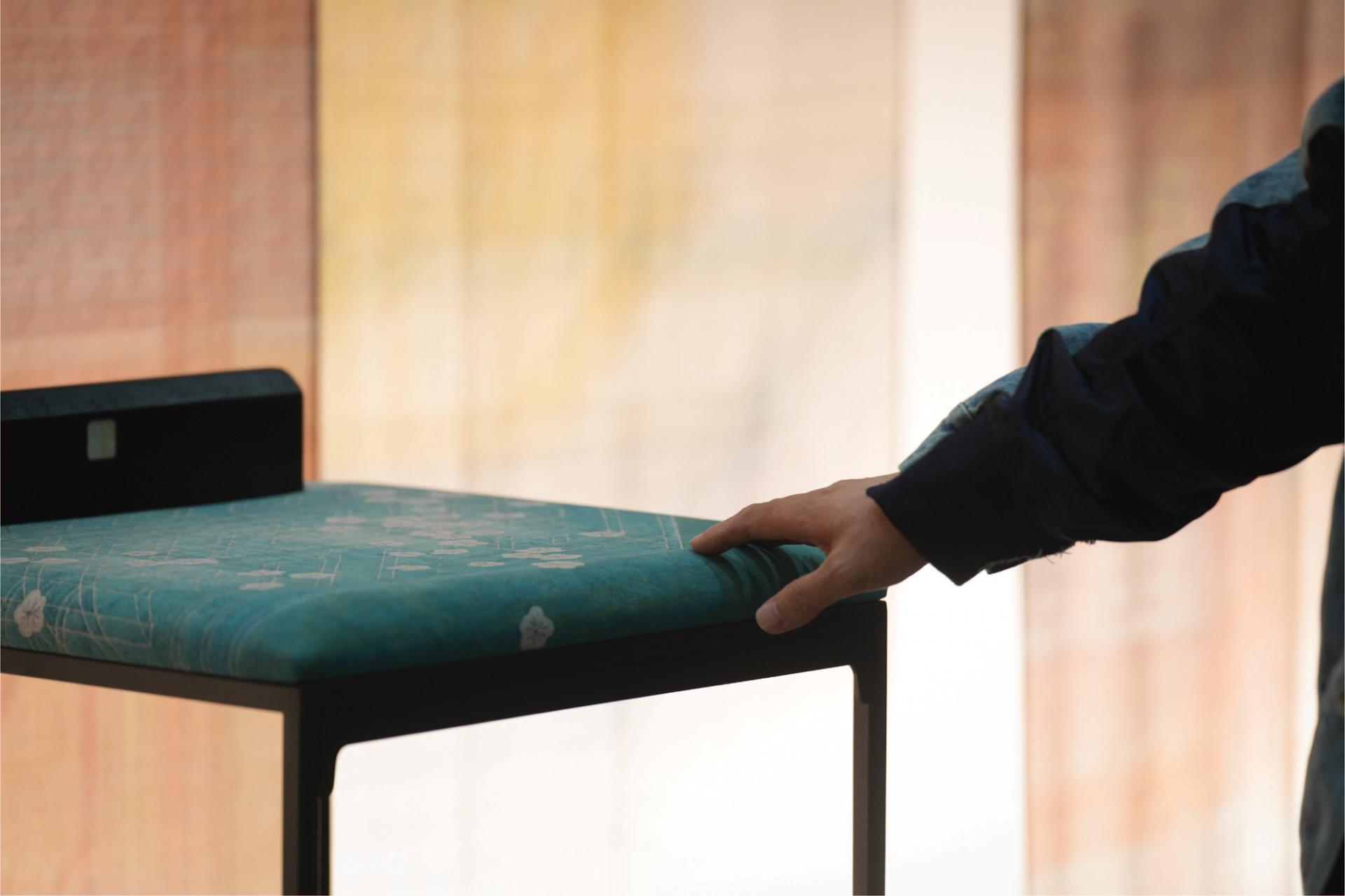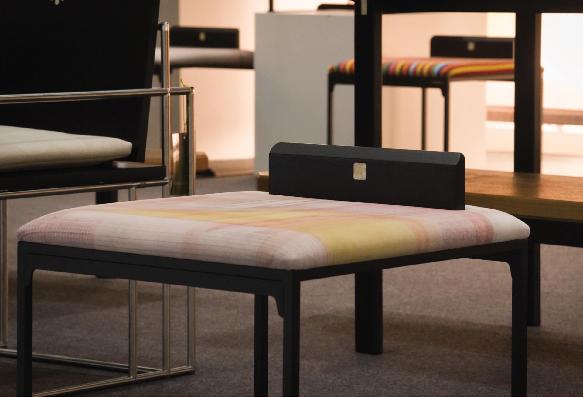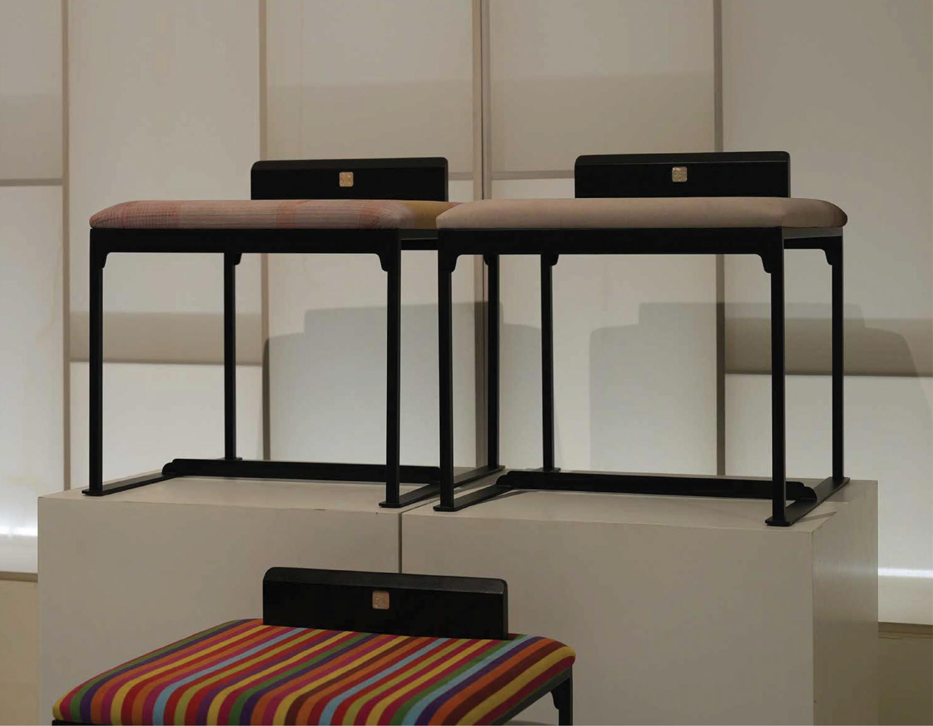 뒤편의 낮은 목재 등받이에는 오랜의 상징인 자개 인레이 기법을 사용하였다,