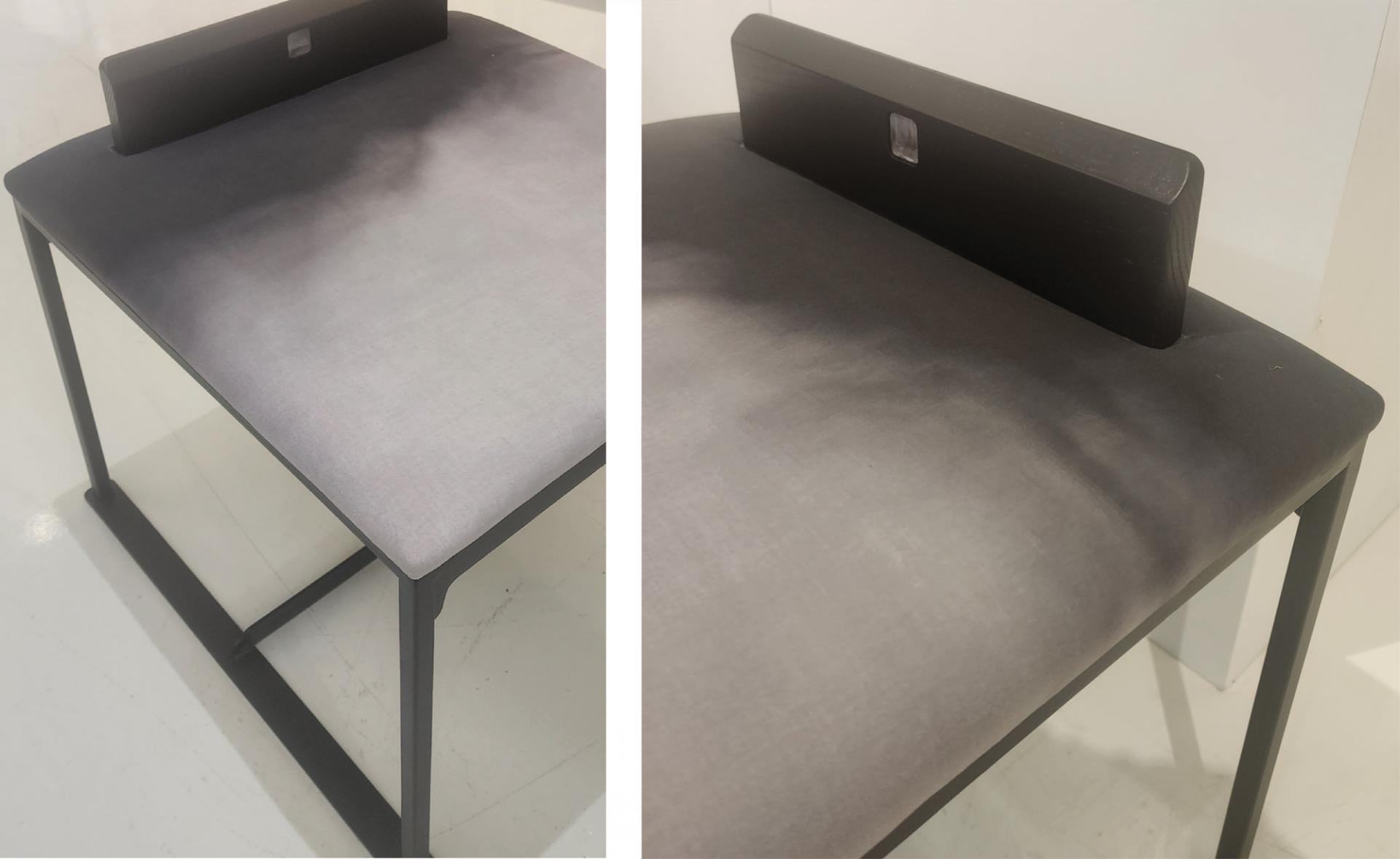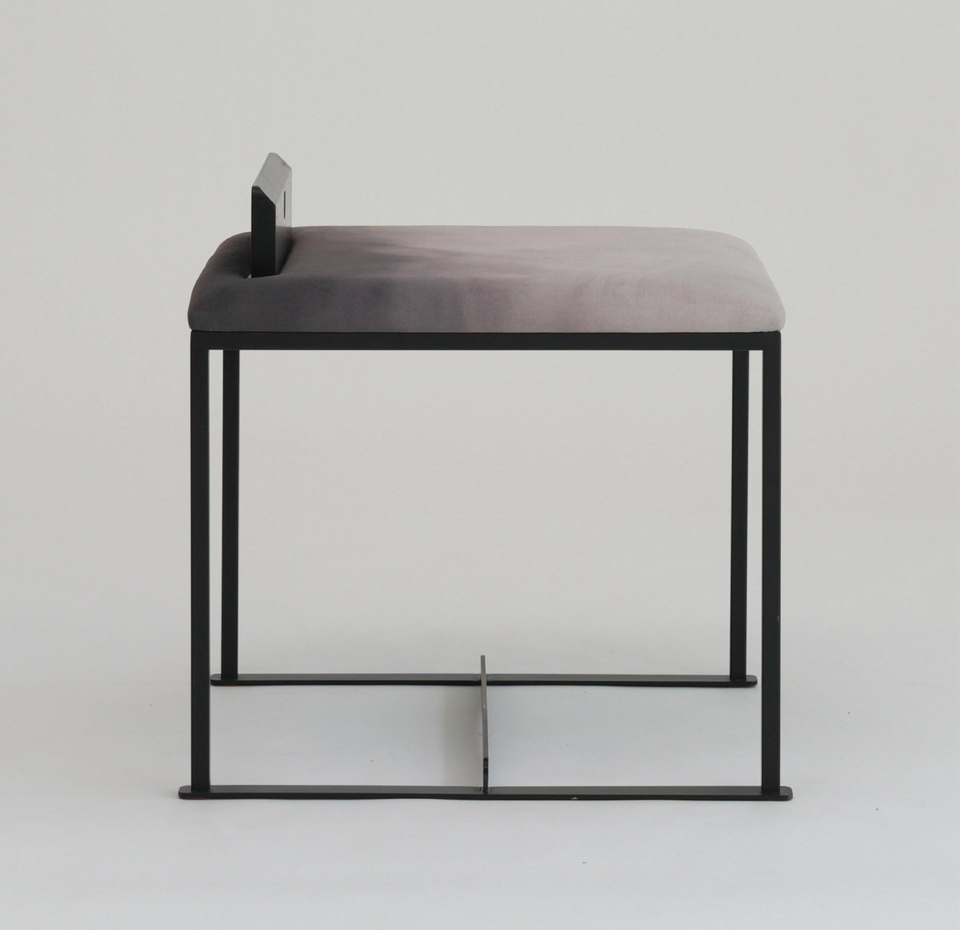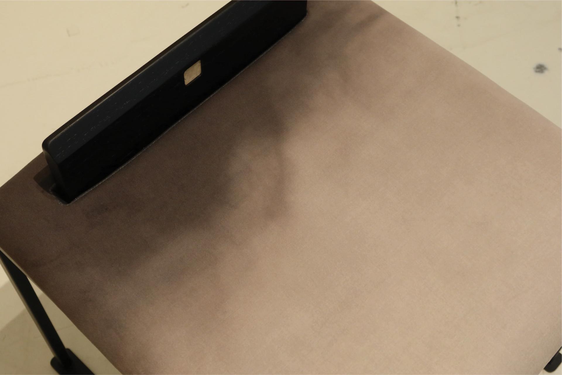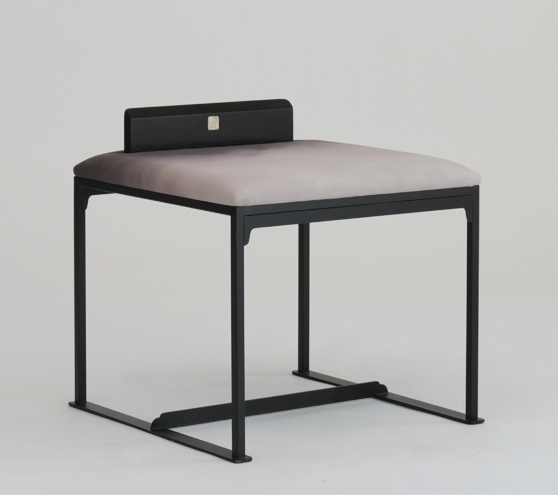 블랙 금속 프레임이 섬세하게 단단한 구조를 이루고, 위에는 먹빛이 스며든 듯한 패브릭 방석이 얹혀있는 형태로