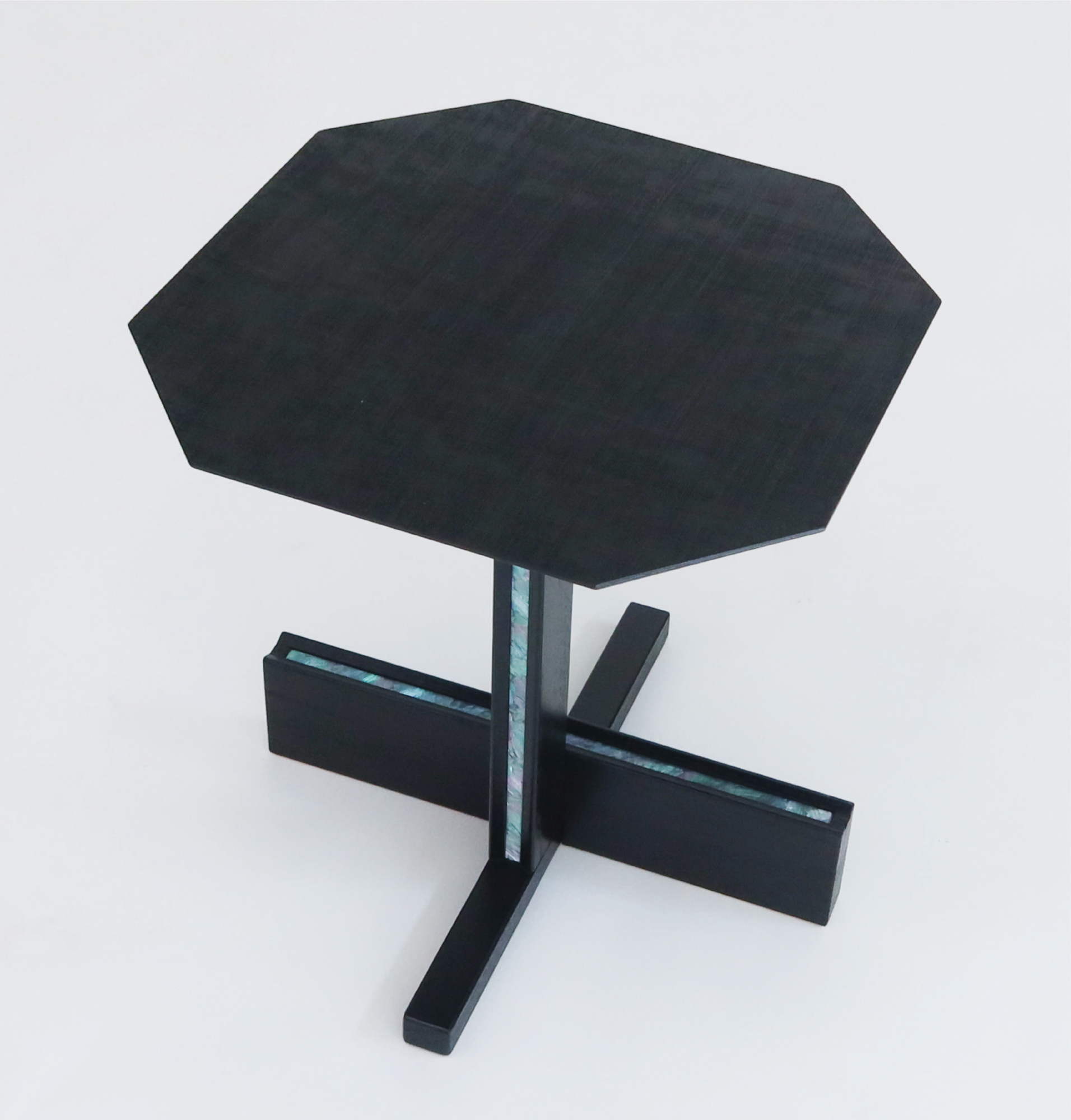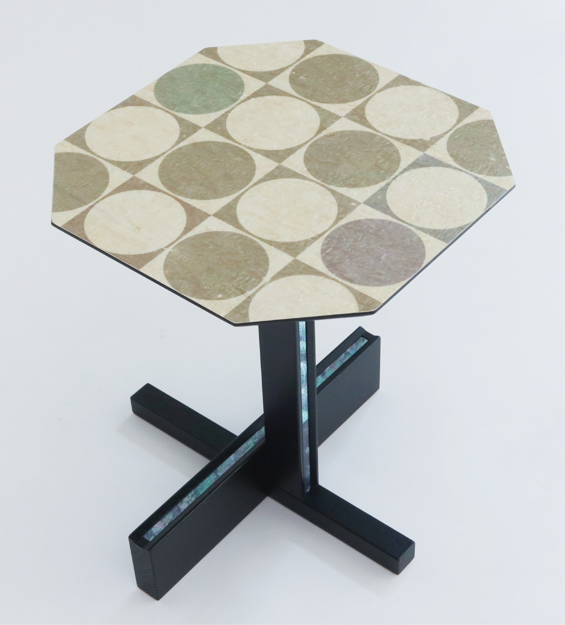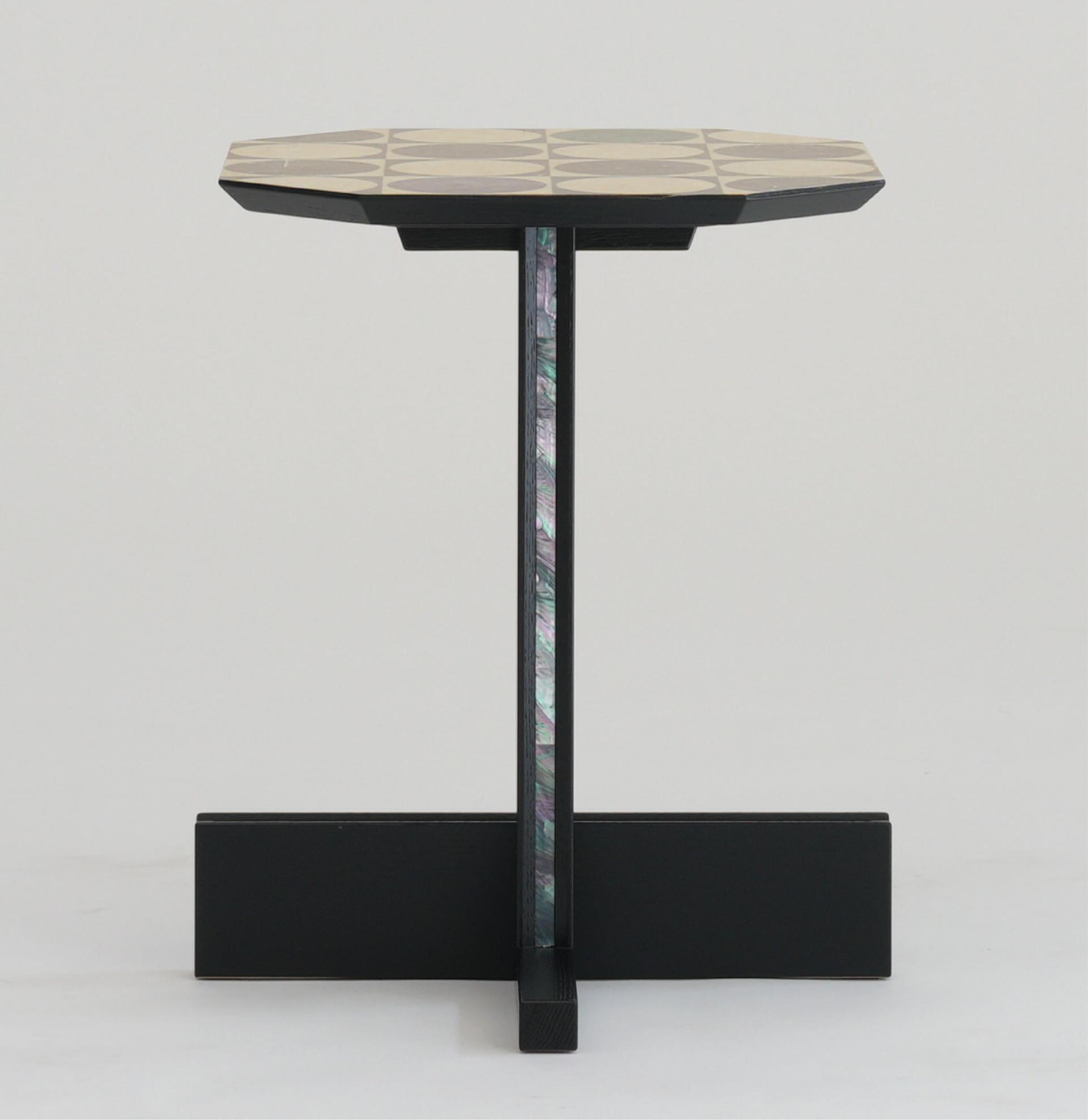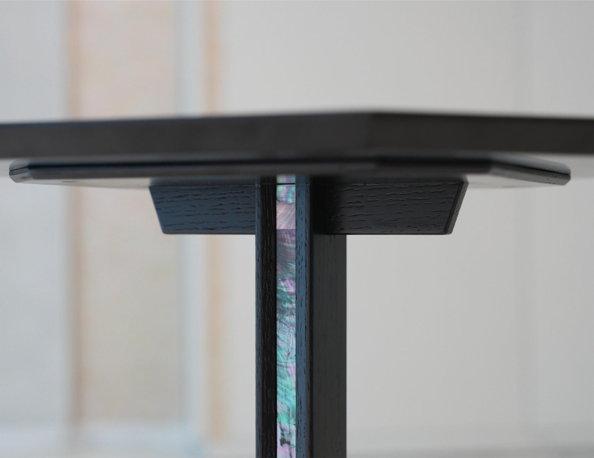 여덟 면으로 구성된상판과 직선적인 다리 구조는 절제된 기하학적 아름다움을 보여주며,자개 디테일이 은은한 빛을 발산하여 한국적 감각을 현대적으로 해석한다 .