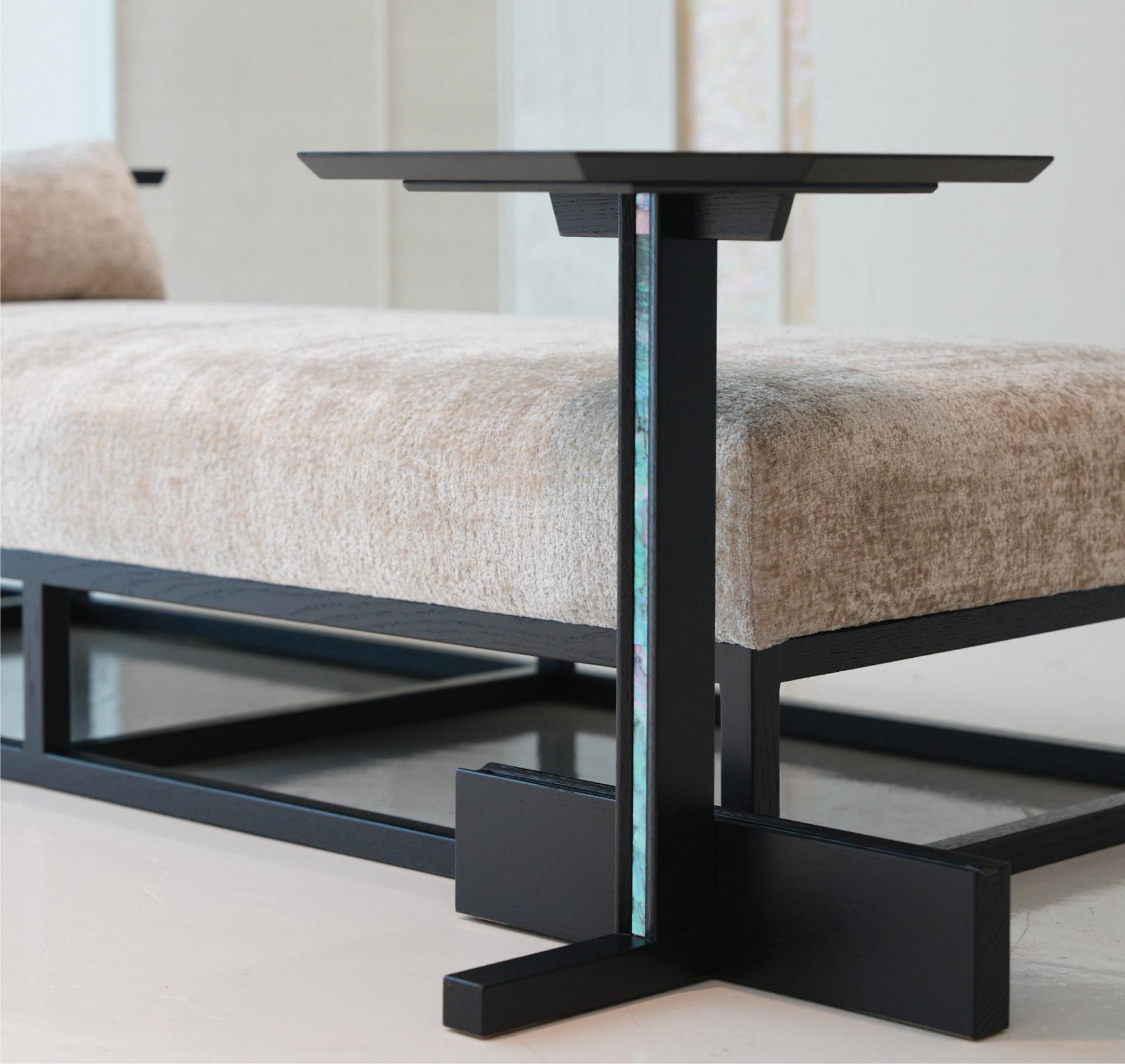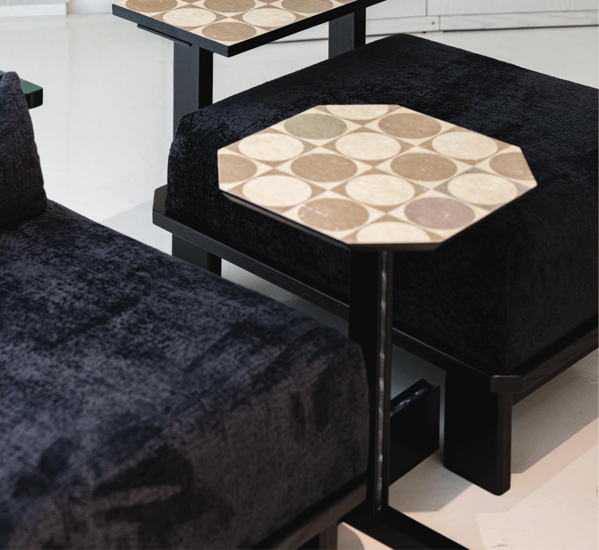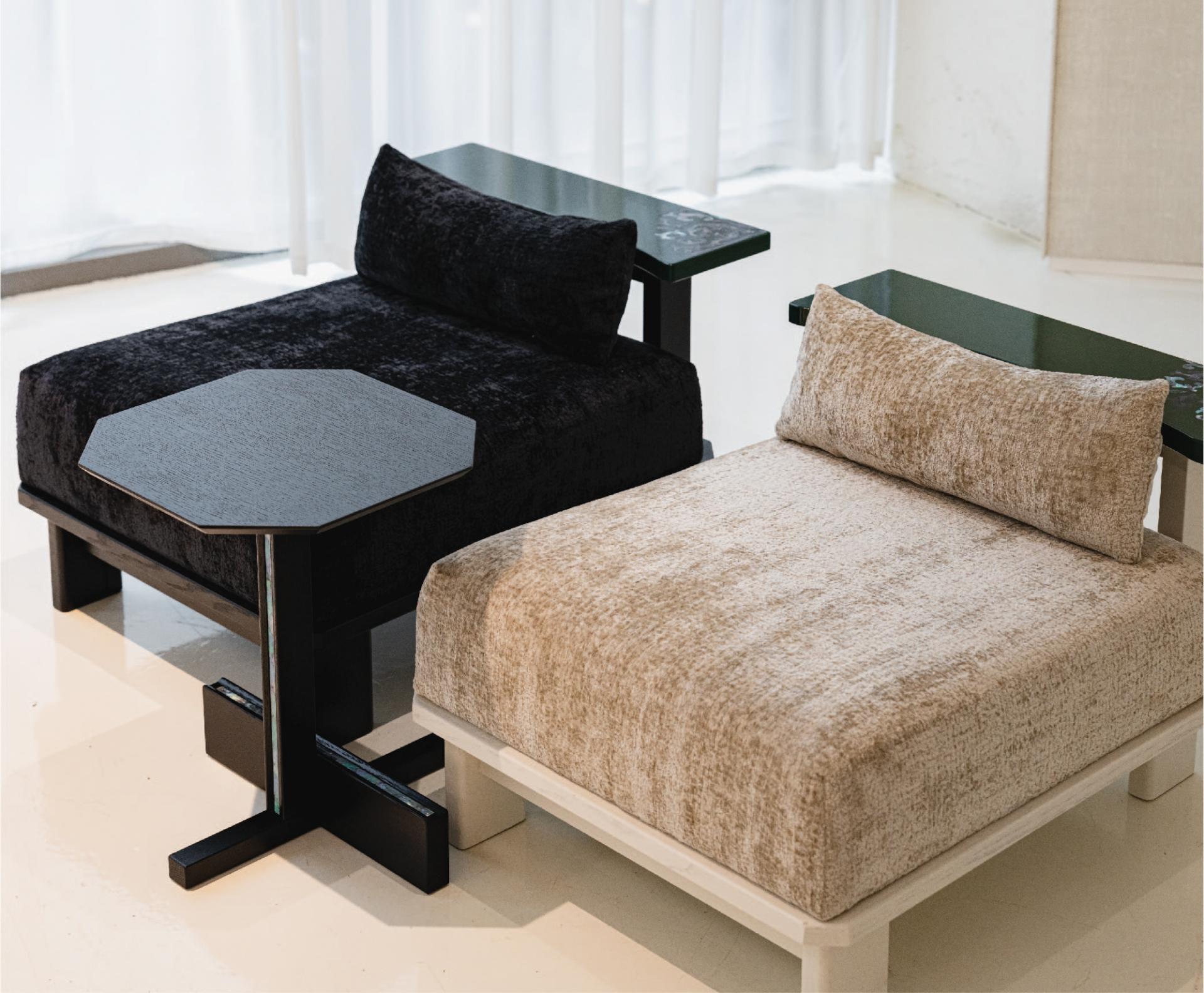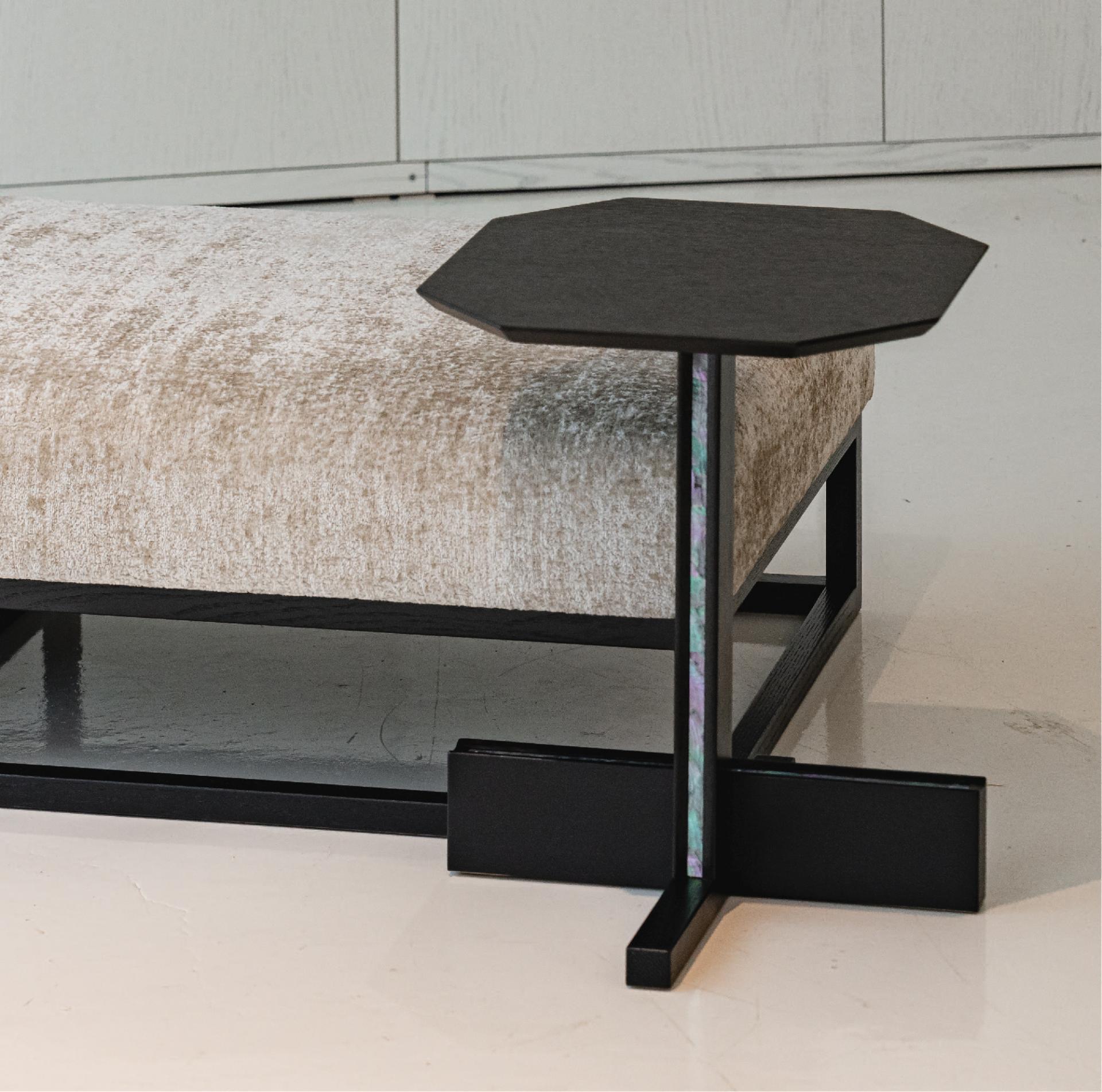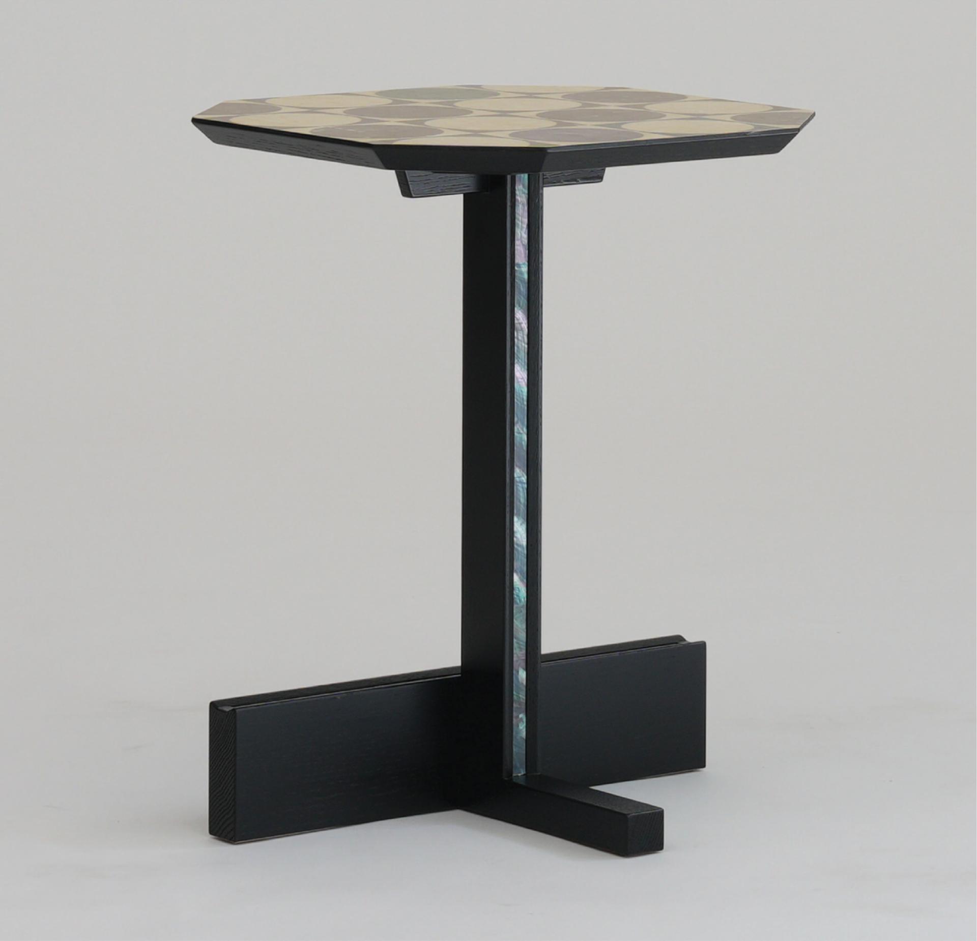 여덟 면으로 구성된상판과 직선적인 다리 구조는 절제된 기하학적 아름다움을 보여주며,자개 디테일이 은은한 빛을 발산하여 한국적 감각을 현대적으로 해석한다 .