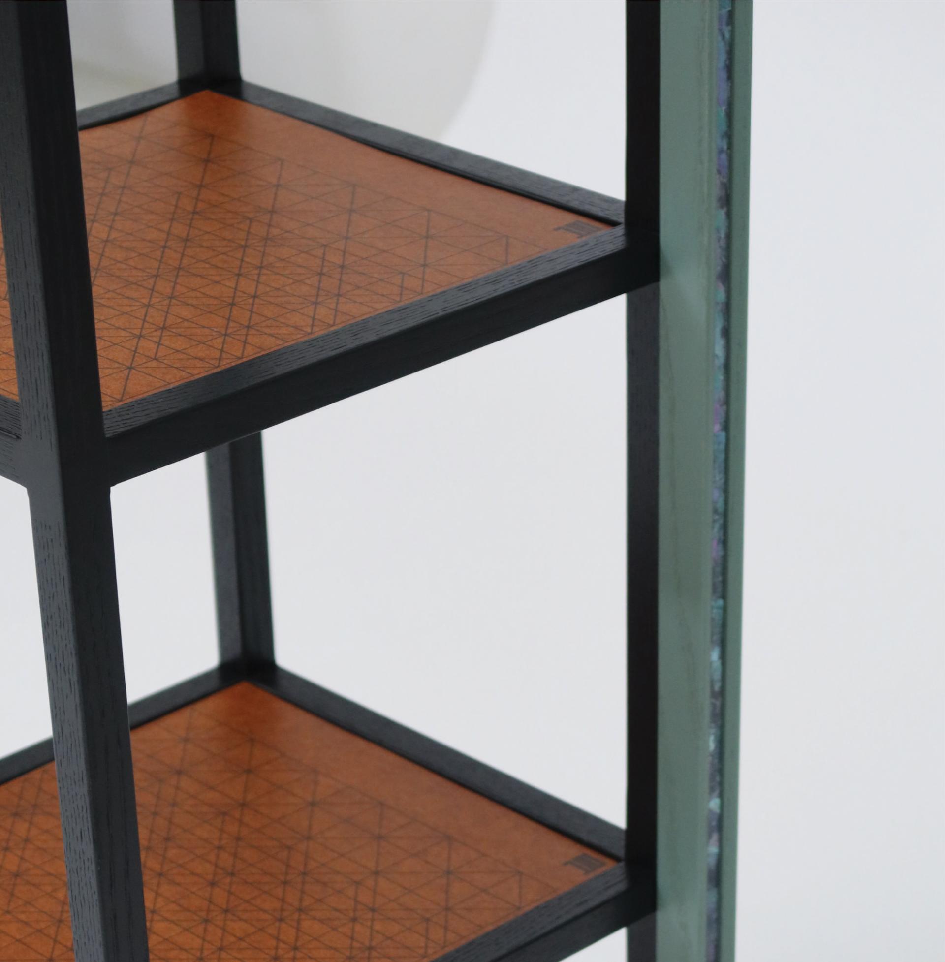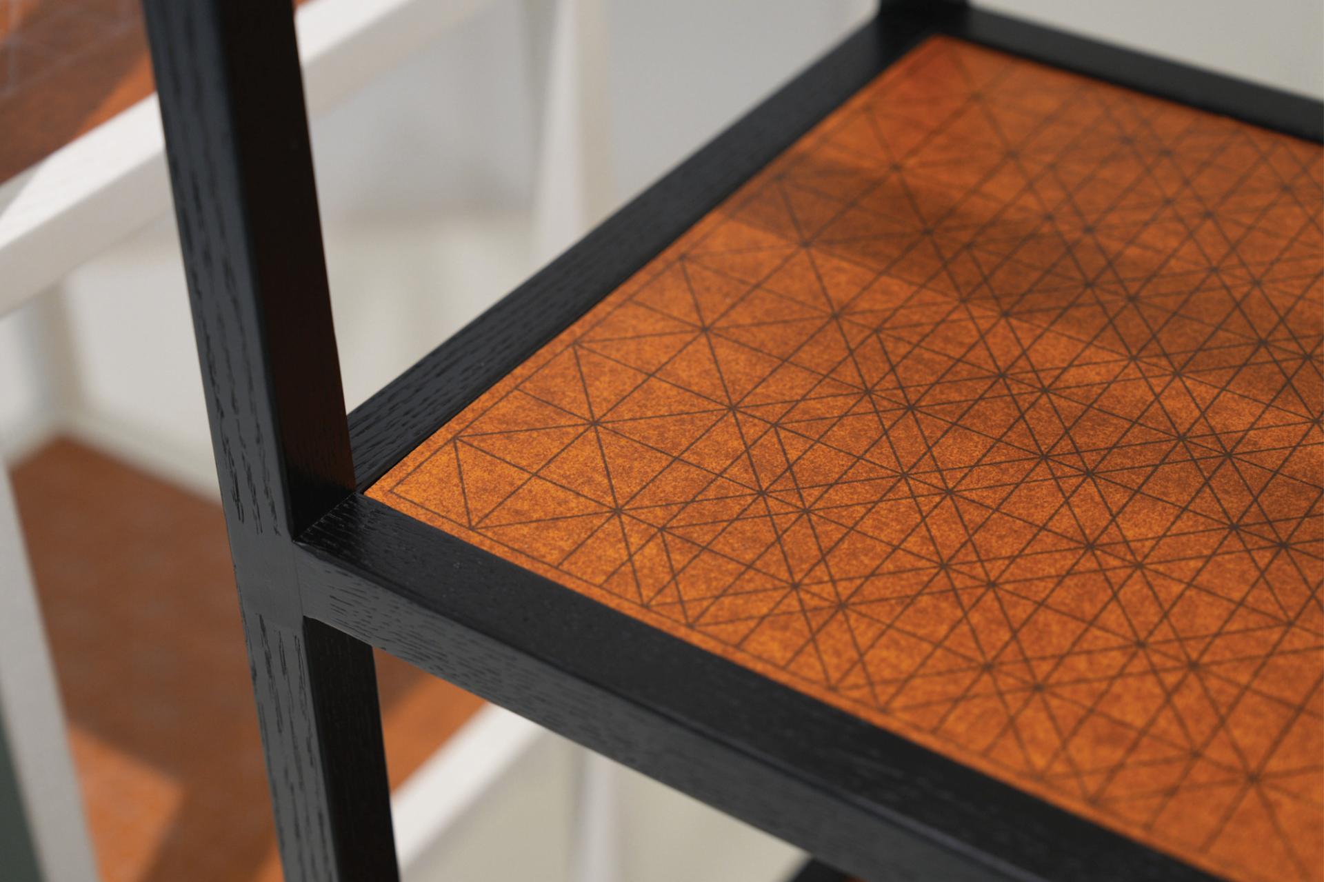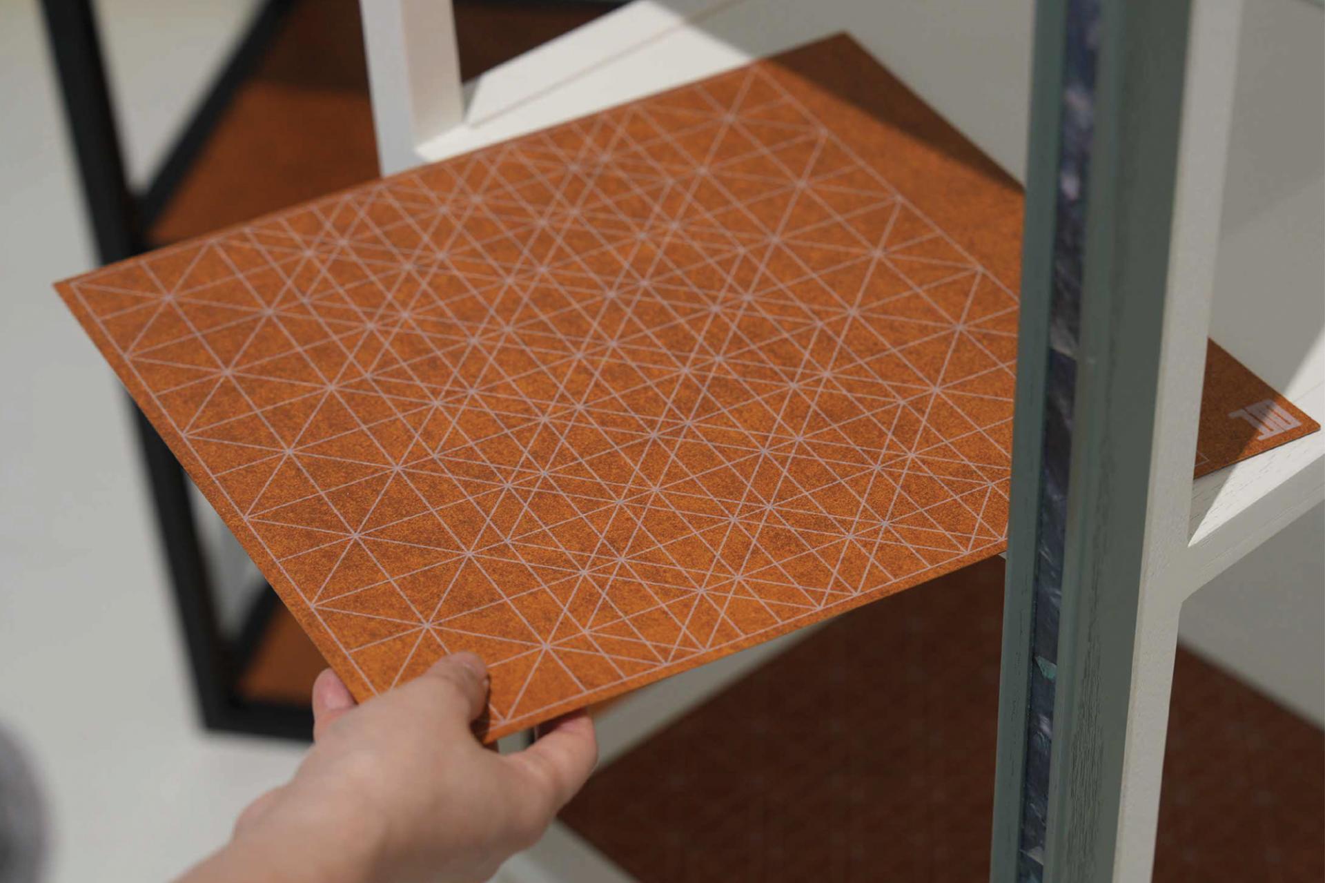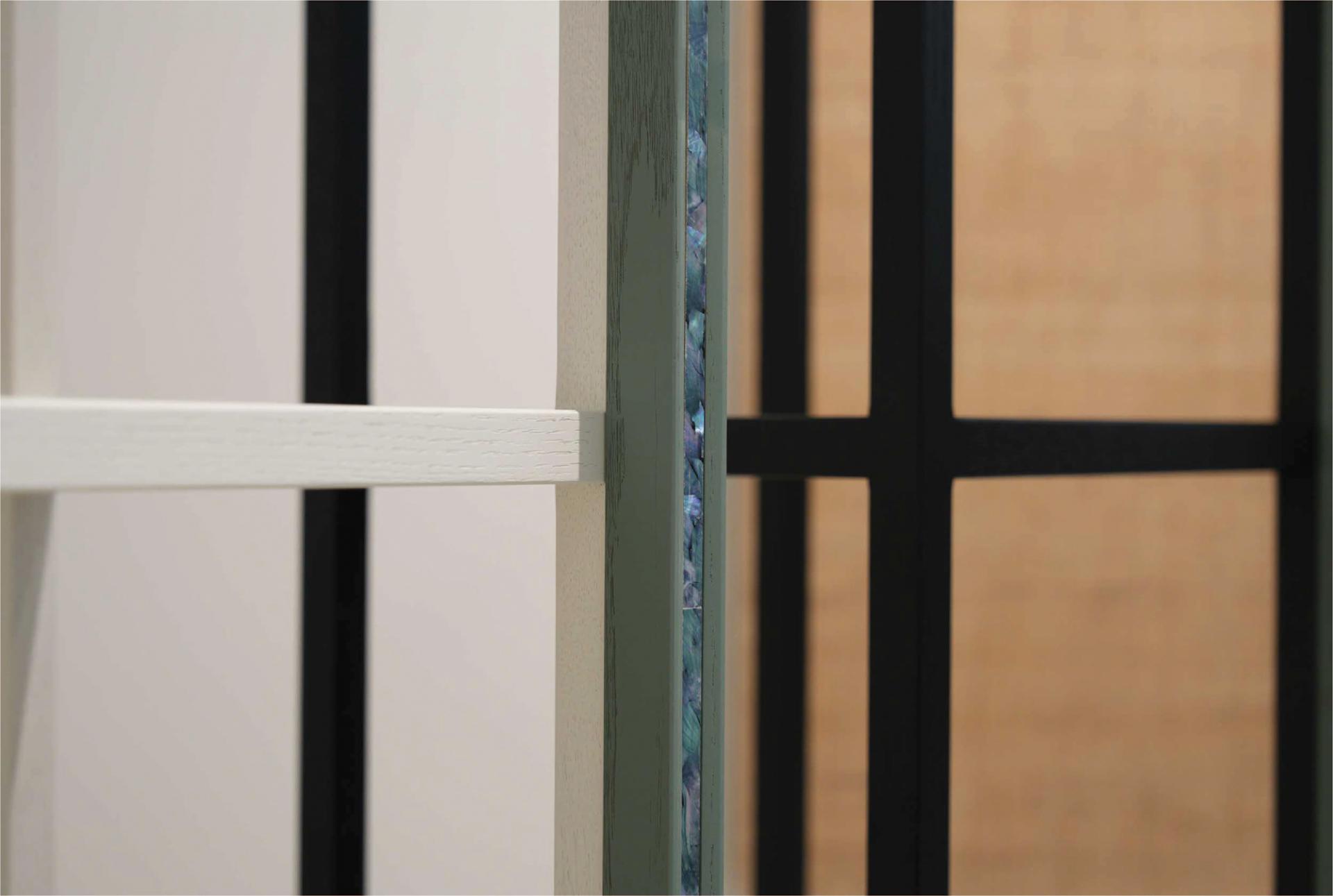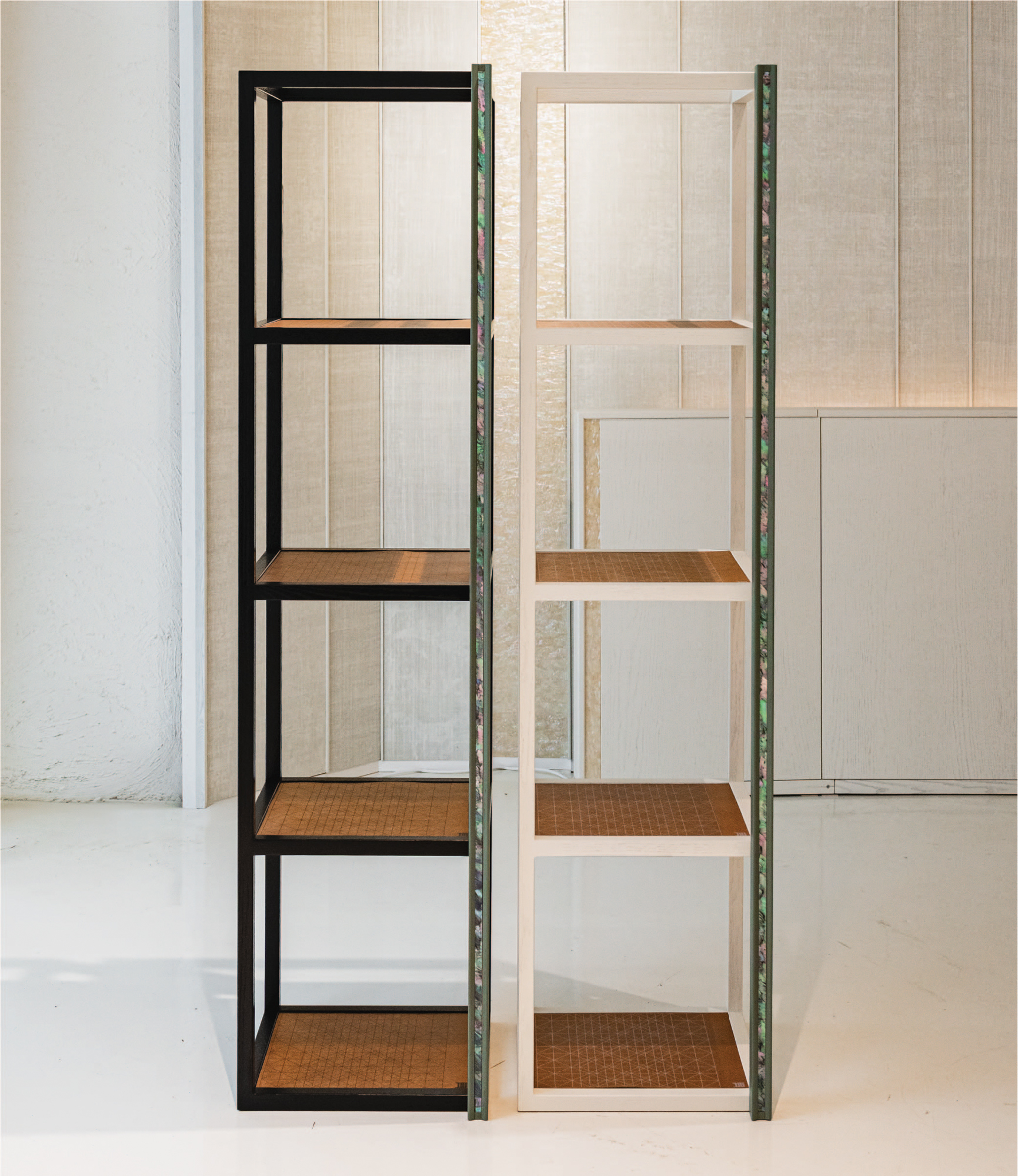 내부 선반에는 전통소재인 '한지 8배지'에 '옻'을 입힌 매트가 탈착이 가능한 패널로 구성되어 있으며,