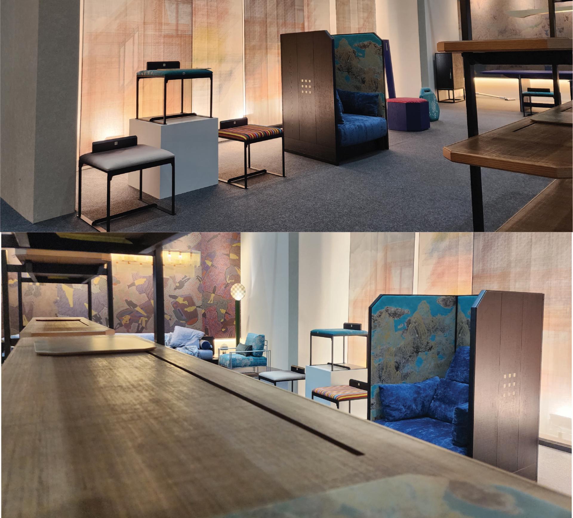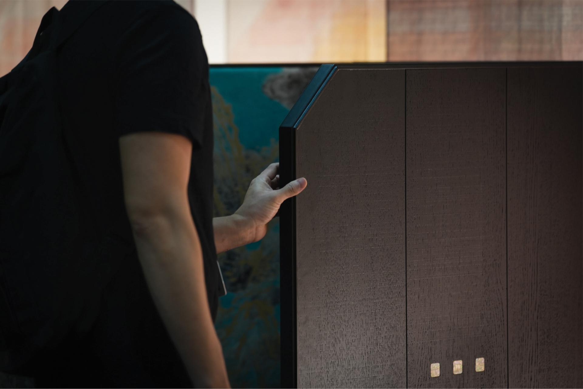 이 구조는 동시에 ‘공간 속 중심’을 시각화하며, 사용자를 하나의 상징적 존재로 자리시킨다.측면 목재에 새겨진 자개의 사각 패턴은 왕의 자리에서 발산되는 조용한 권위의 빛을 표현한다.