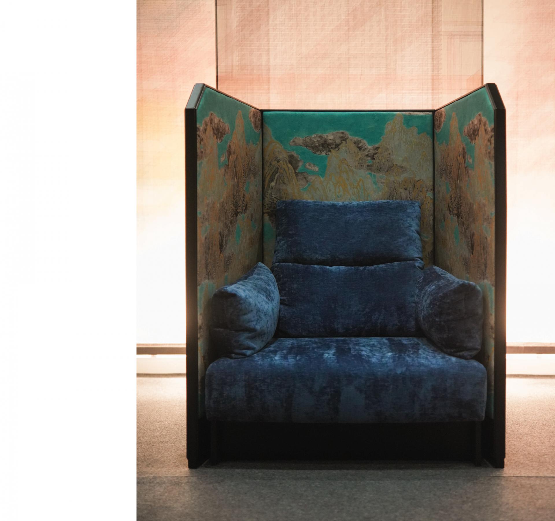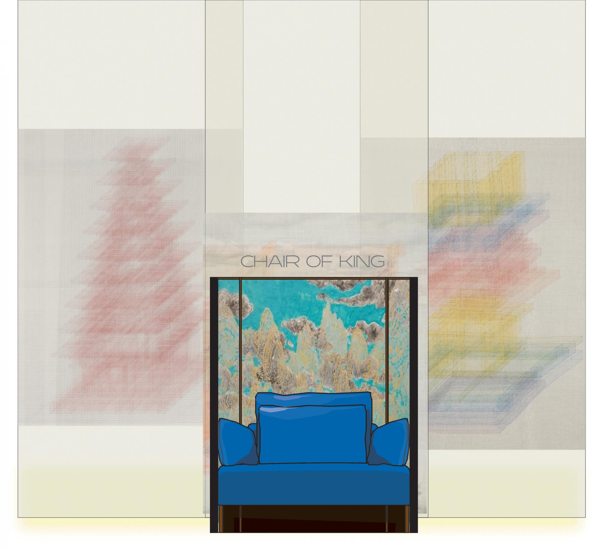 푸른 벨벳 쿠션은 인간적 온기와 휴식을 상징하고,그를 감싸는 스크린은 산수의 이미지를 품어, 자연과 인간, 권위와 평온의 관계를 하나의 장면으로 응축시킨다.
